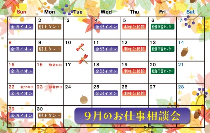 日時:9/2(月)・9(月)・30(月)